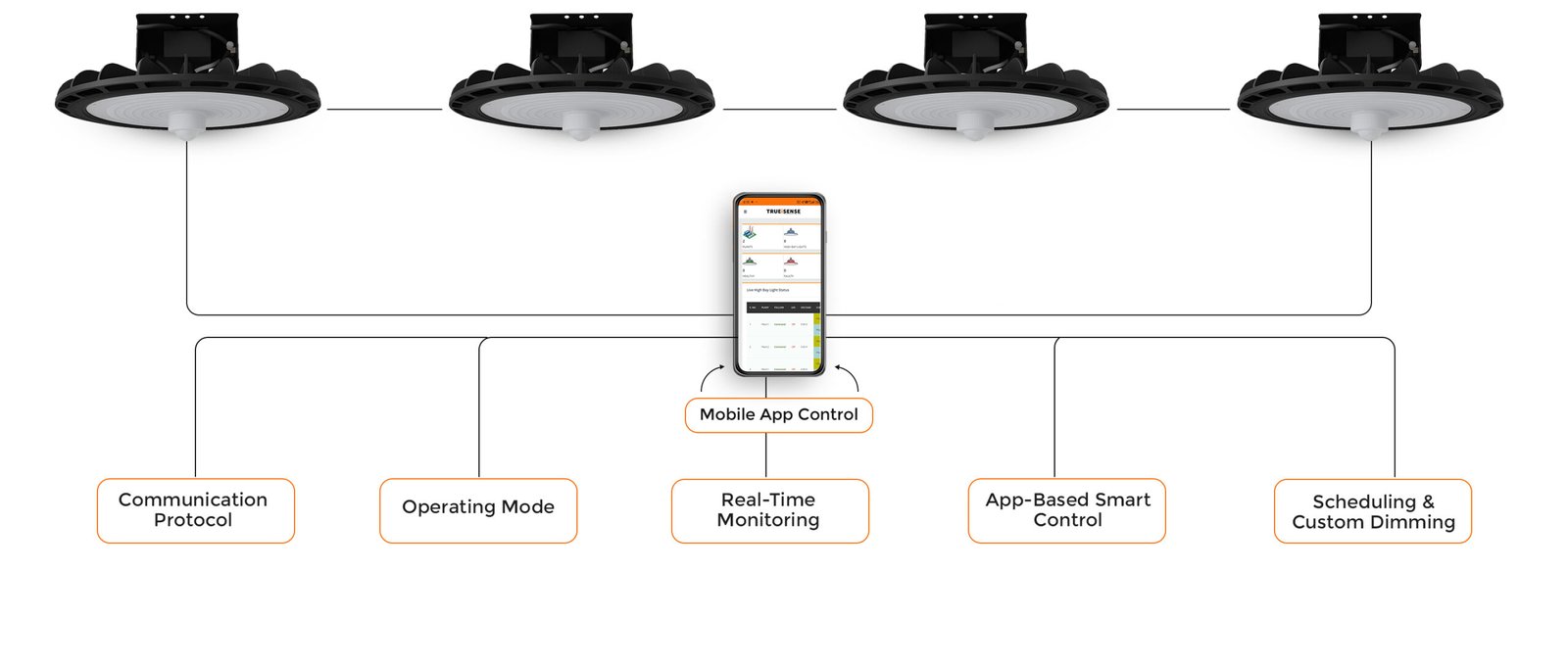 Motion Sensor Highbay Solutions featuring smart connectivity, where each Highbay Light is linked to an app via SIM or Wi-Fi for seamless monitoring and control